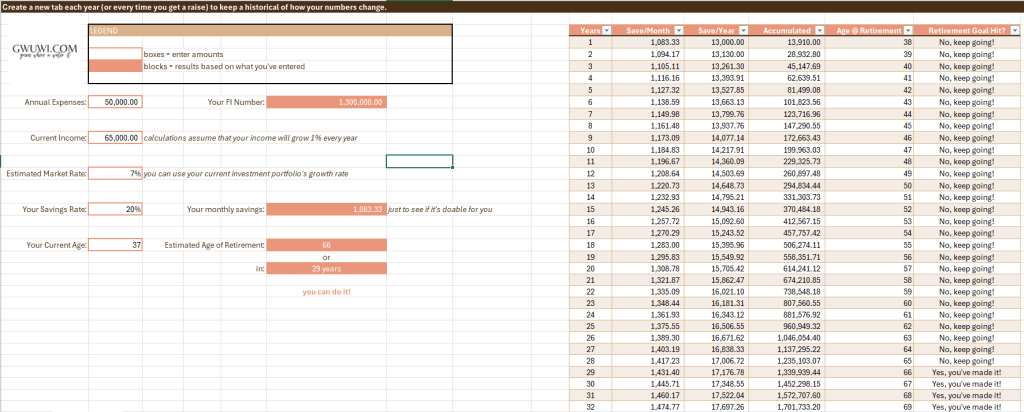Track your progress using the free calculator below. Create a new tab for each year to keep a historical record of your progress as you experience pay increases, etc.