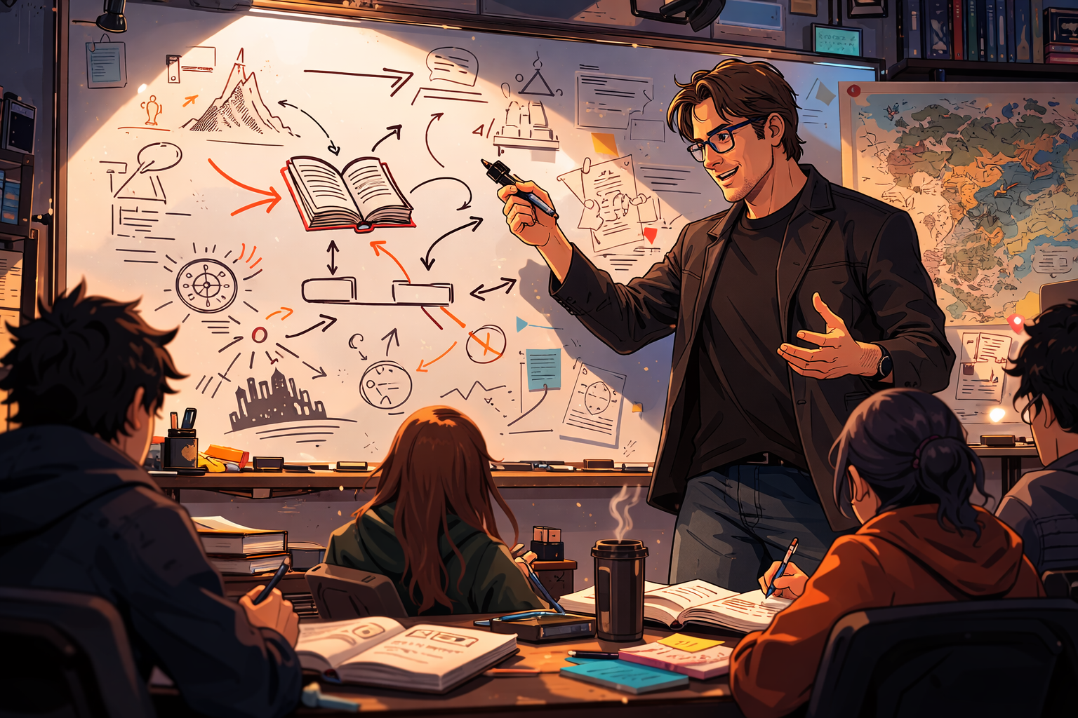 Before writing a novel, he usually creates a detailed roadmap of the story, including: